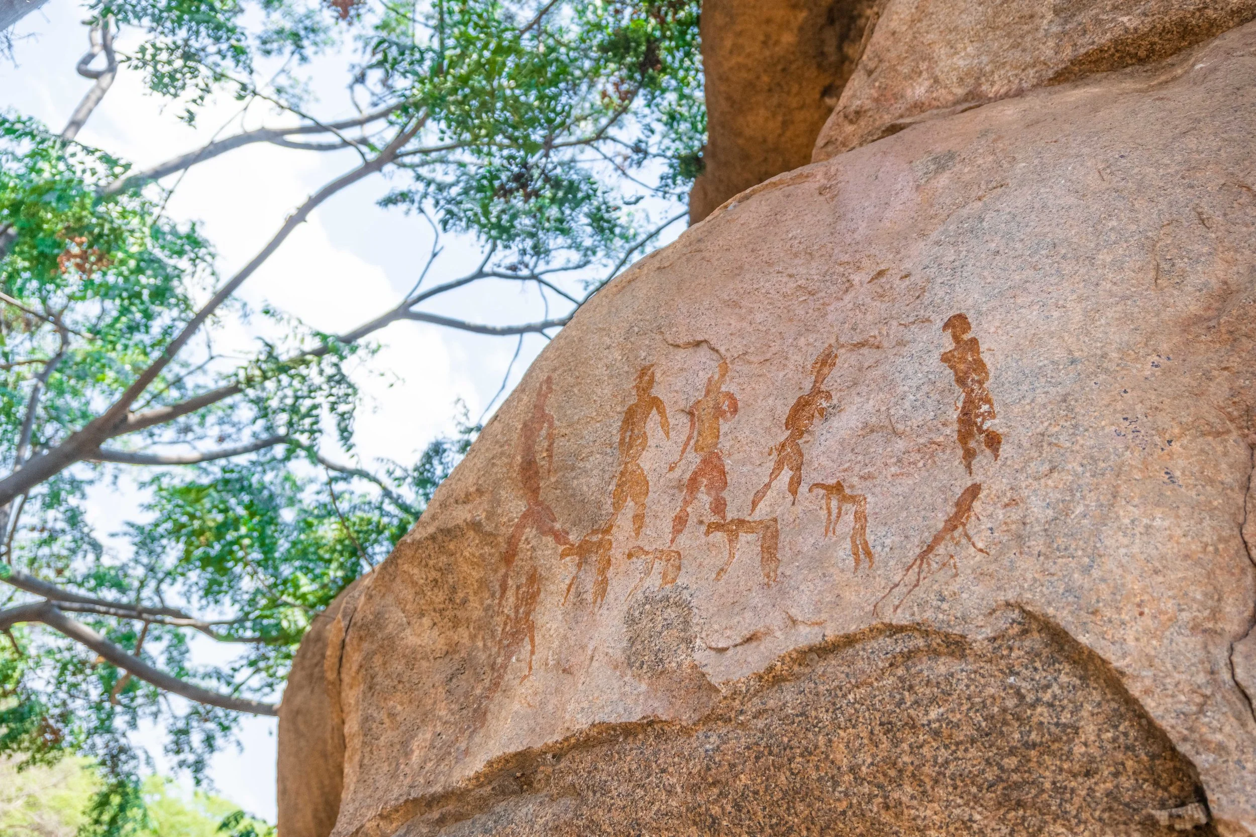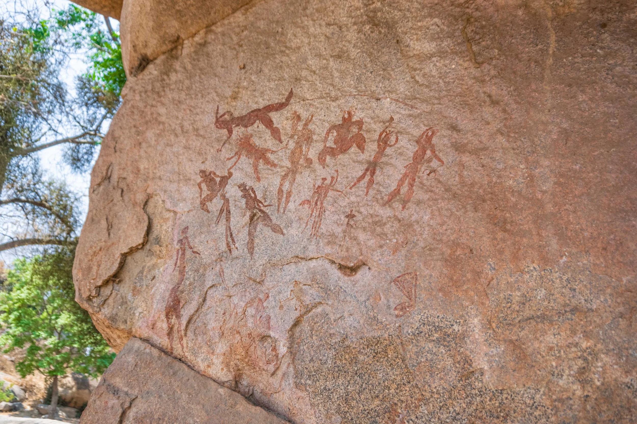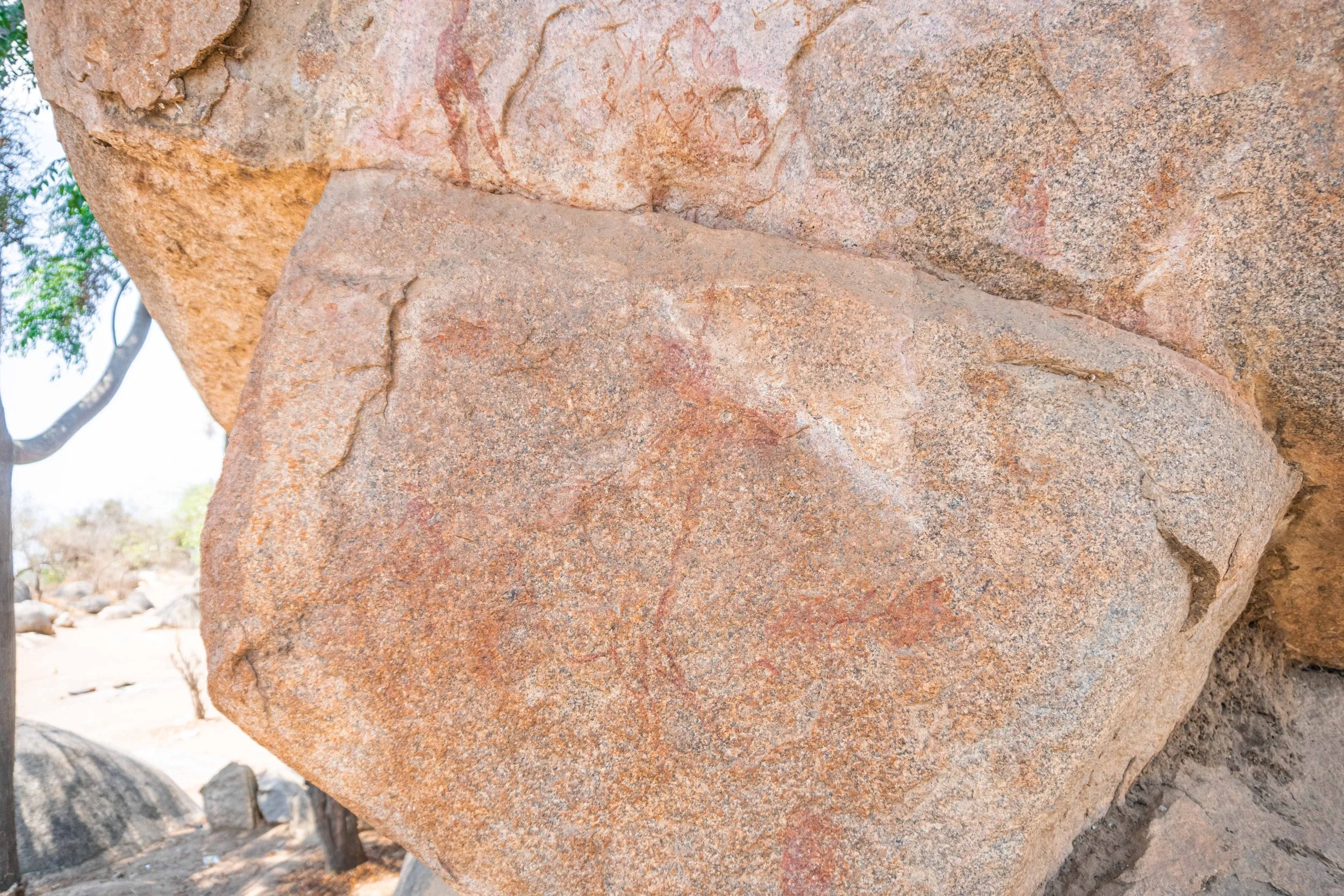 The Bridge paintings occur on a naturally shaped granite that functions visually and symbolically as a connecting feature within the outcrop. Figures and motifs here are distributed across both the vertical faces and the horizontal surface of the rock bridge, creating a sense of movement across space and form.