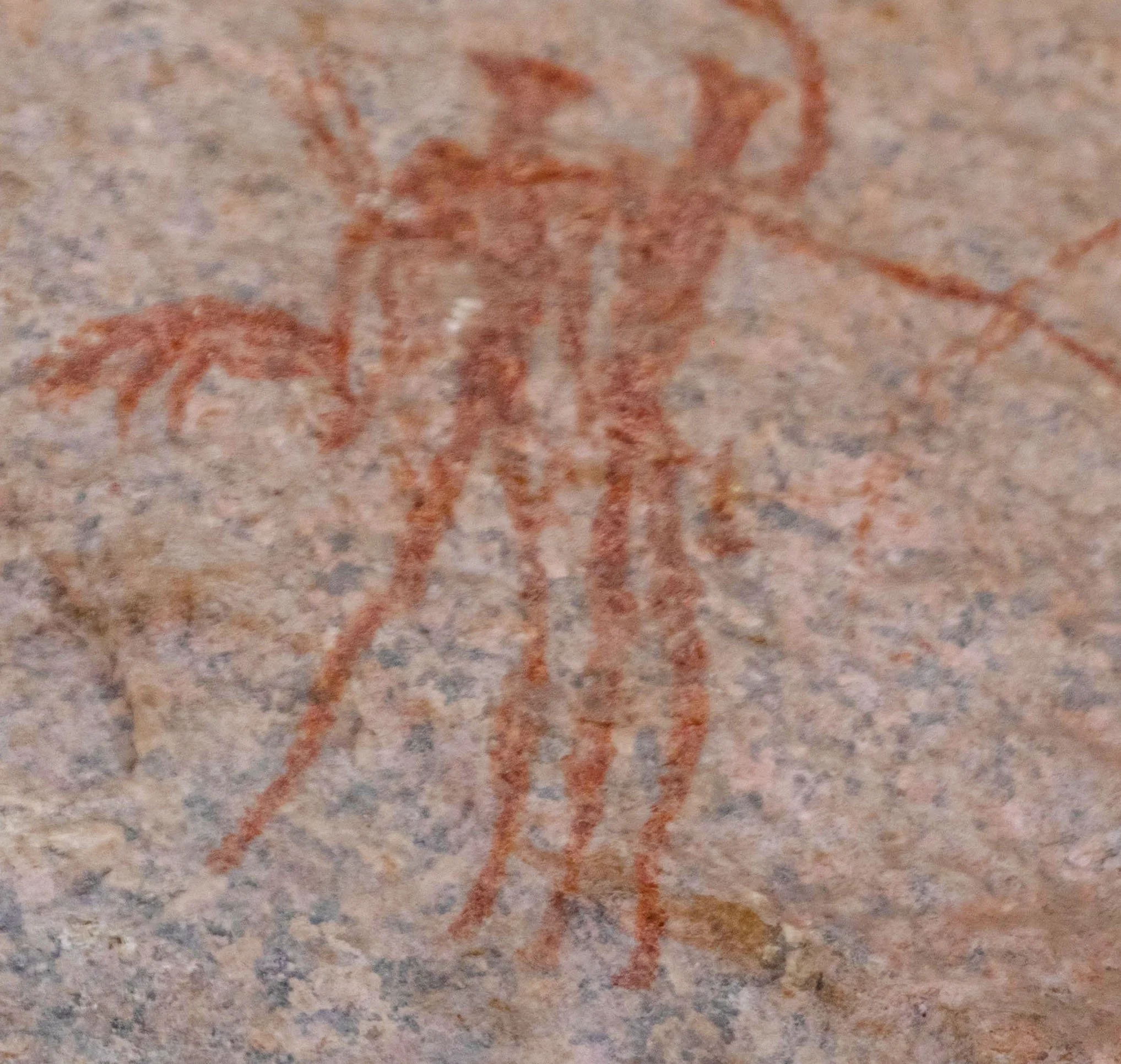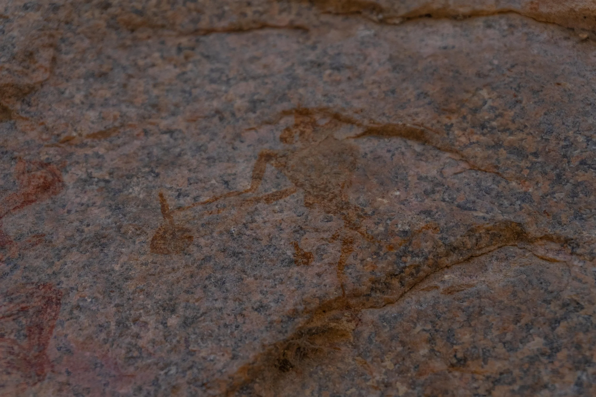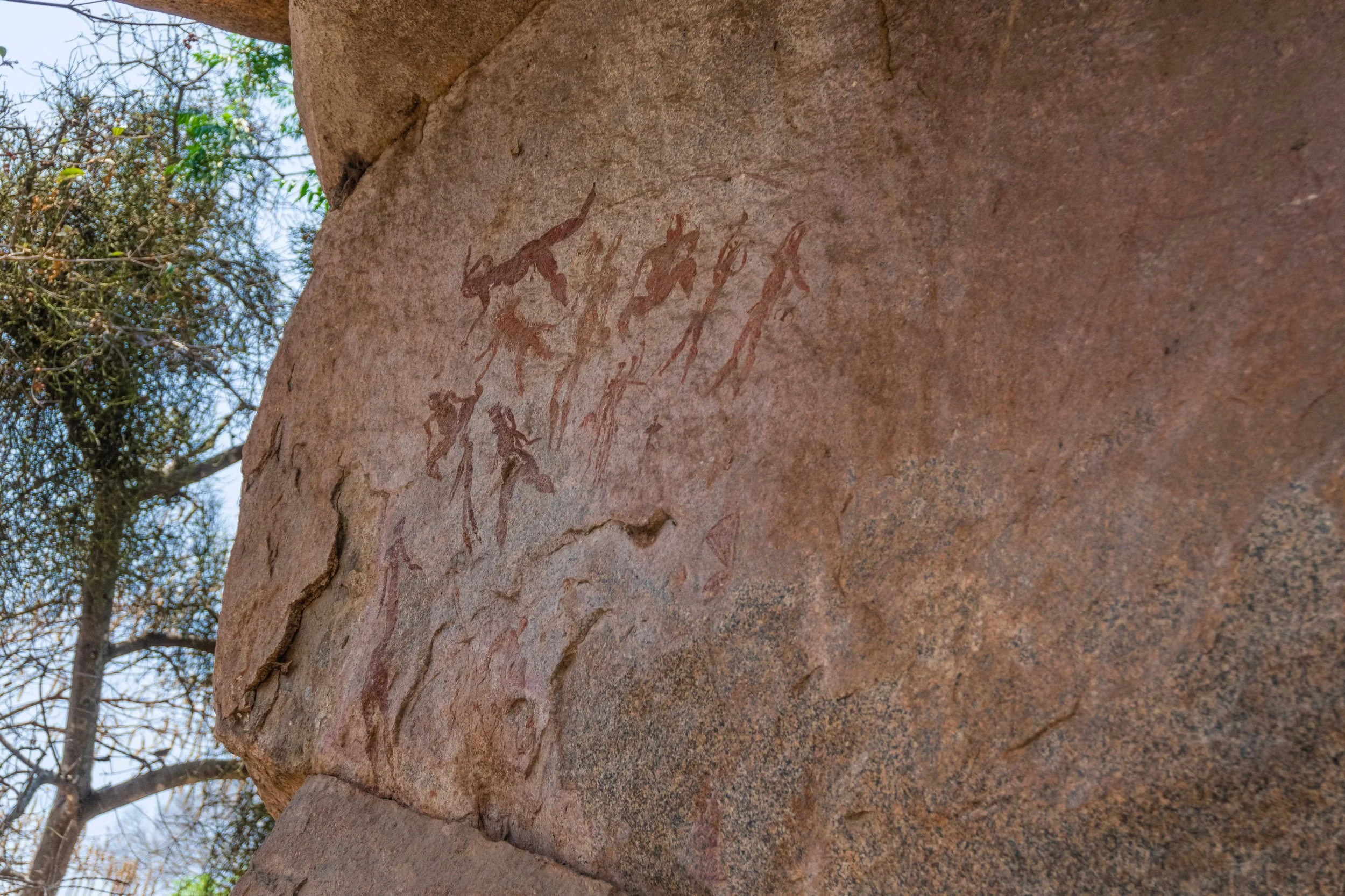 The Bridge paintings occur on a naturally shaped granite that functions visually and symbolically as a connecting feature within the outcrop. Figures and motifs here are distributed across both the vertical faces and the horizontal surface of the rock bridge, creating a sense of movement across space and form.